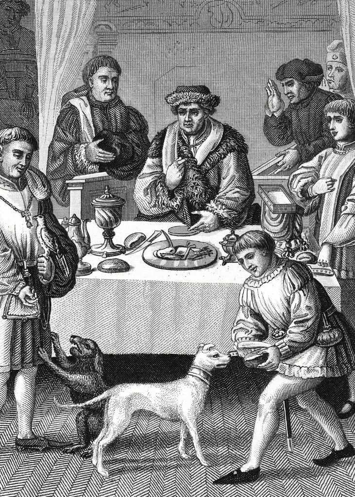 Der Ursprung des Lebensmittelimportes und -exportes findet sich, wenn auch nicht so ausgeprägt, schon im Mittelalter. Dort wurden z. B. Reis, Feigen, Datteln, Pomeranzen oder auch Limonen aus anderen Ländern geholt. Allerdings in so kleinen Mengen, dass sie meistens nur für den gehobenen Teil der Bevölkerung zur Verfügung standen. Die Kartoffel, das heutzutage typisch-regionale Produkt, gibt es tatsächlich erst seit dem 16. Jahrhundert. Und auch Tomaten wurden erst während Kolumbus zweiter Amerika-Reise im 15. Jahrhundert entdeckt. Was hingegen weit aus früher entdeckt wurde, war der Fleischkonsum. In der heutigen Zeit verzichten immer mehr Leute auf tierische Produkte und achten mehr auf eine umweltbewusstere bzw. artgerechtere Weise Tiere zu halten. Im Mittelalter war das wohl nicht mal ein Gedanke. Auch wenn die Haltung der Tiere früher teilweise artgerechter war, waren die Tiere damals hauptsächlich Nutztiere. Sie halfen den Bauern beim Pflügen der Felder, beim Ziehen von anderen Schwertransporten und in erster Linie waren sie auch ein wichtiger Bestandteil der Nahrung. Damals wurde nahezu alles vom Tier verarbeitet. Etwas übrig geblieben ist selten bis gar nicht, da man lernte Fleisch gut und lange haltbar zu machen, z. B. durch Räuchern, Austrocknen oder Einsalzen. Der Adel hingegen verzehrte nur das beste des Tieres, was meistens dann zubereitetes Fleisch wie ein Braten war. Außerdem stand nur dem Adel zu, auf die Jagd zu gehen. Somit verfügten sie über eine deutlich größere Auswahl an Fleisch im Gegensatz zu den normalen Bauern. Ein Adelsessen im 13. Jahrhunderts sah womöglich so aus: Kirschen, Weißbrot, vorzüglicher Wein dazu junge Bohnen in Milch gekocht. Nachdem so genannten ersten Gang folgten dann Fische und Krebse, Aalpasten, Reis in Mandelmilch und Zimt, gebratener Aal mit einer Sauce und zum Schluss gab es dann etwas Süßes in Form von Torten oder Früchten. Was sich für uns jetzt vielleicht normal anhört, war damals ein echtes Festmahl und wurde nur zu besonderen Anlässen wie zum Beispiel der Zusammenkunft im Senser Kloster von König Ludwig IX und den Oberen des Franziskanerordens am 7. Juni 1248 aufgetischt. Ein solches Essen zeigte dem Gast, dass er geehrt wird und seine Ankunft etwas Besonderes war.